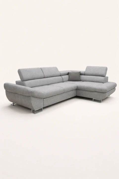 Elegancki narożnik łączący nowoczesny design z funkcjonalnością. Wykonany z wysokiej jakości materiałów, dostępny w różnych kolorach i tkaninach. Wyposażony w funkcję spania i pojemnik na pościel. Idealny do każdego salonu.