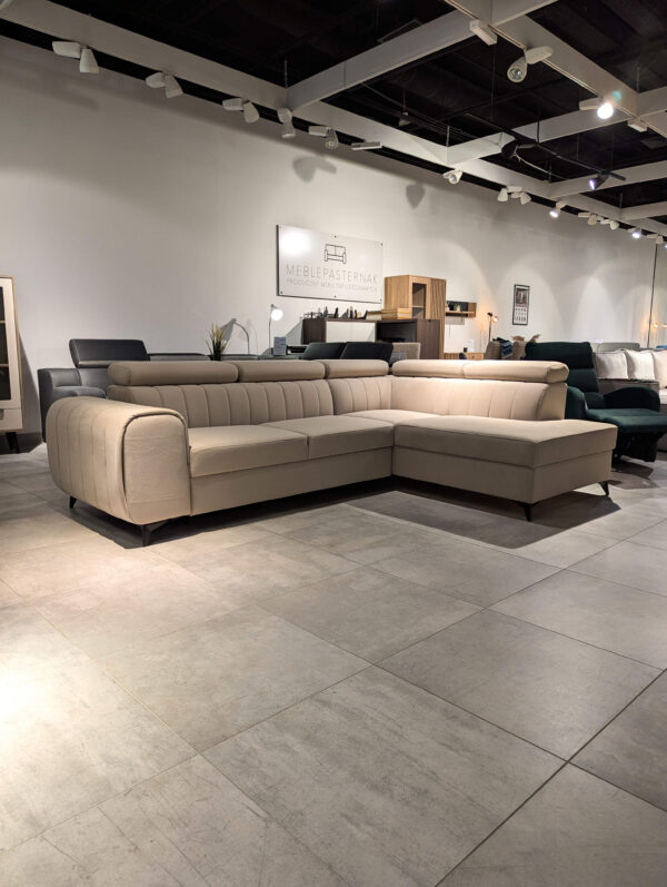 - Funkcja spania – wygodny mechanizm, który w kilka chwil zmienia narożnik w przestronne miejsce do spania.